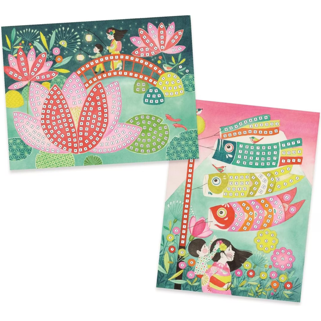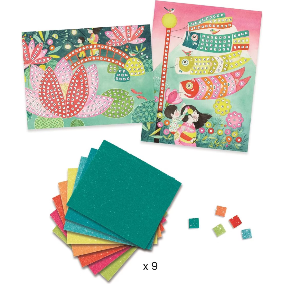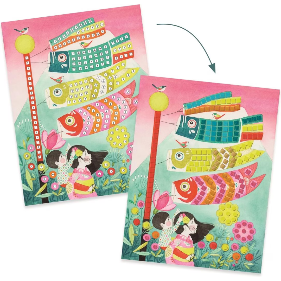 Il set permette di incollare immagini con quadrati colorati, creando composizioni uniche ispirate allo stile giapponese.
