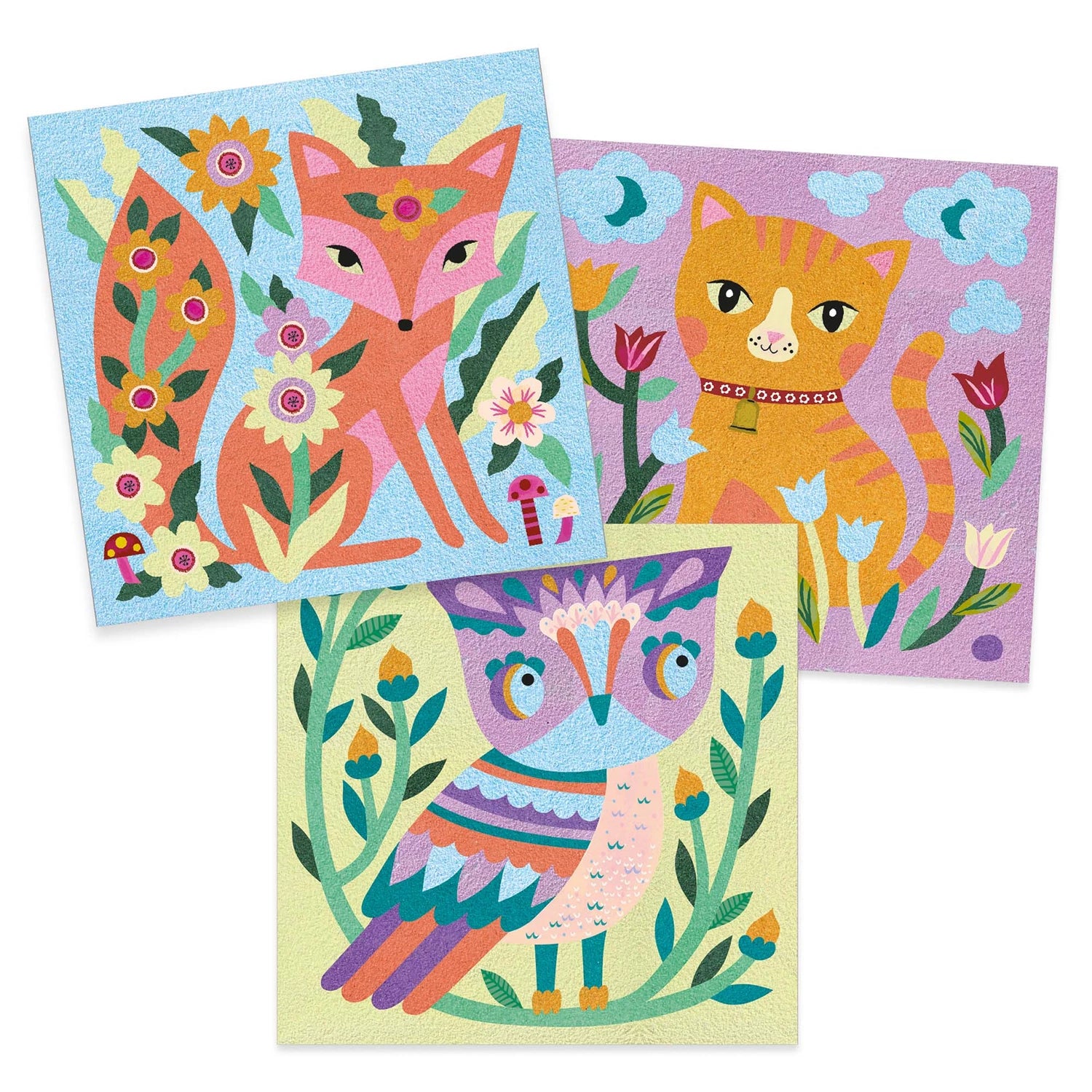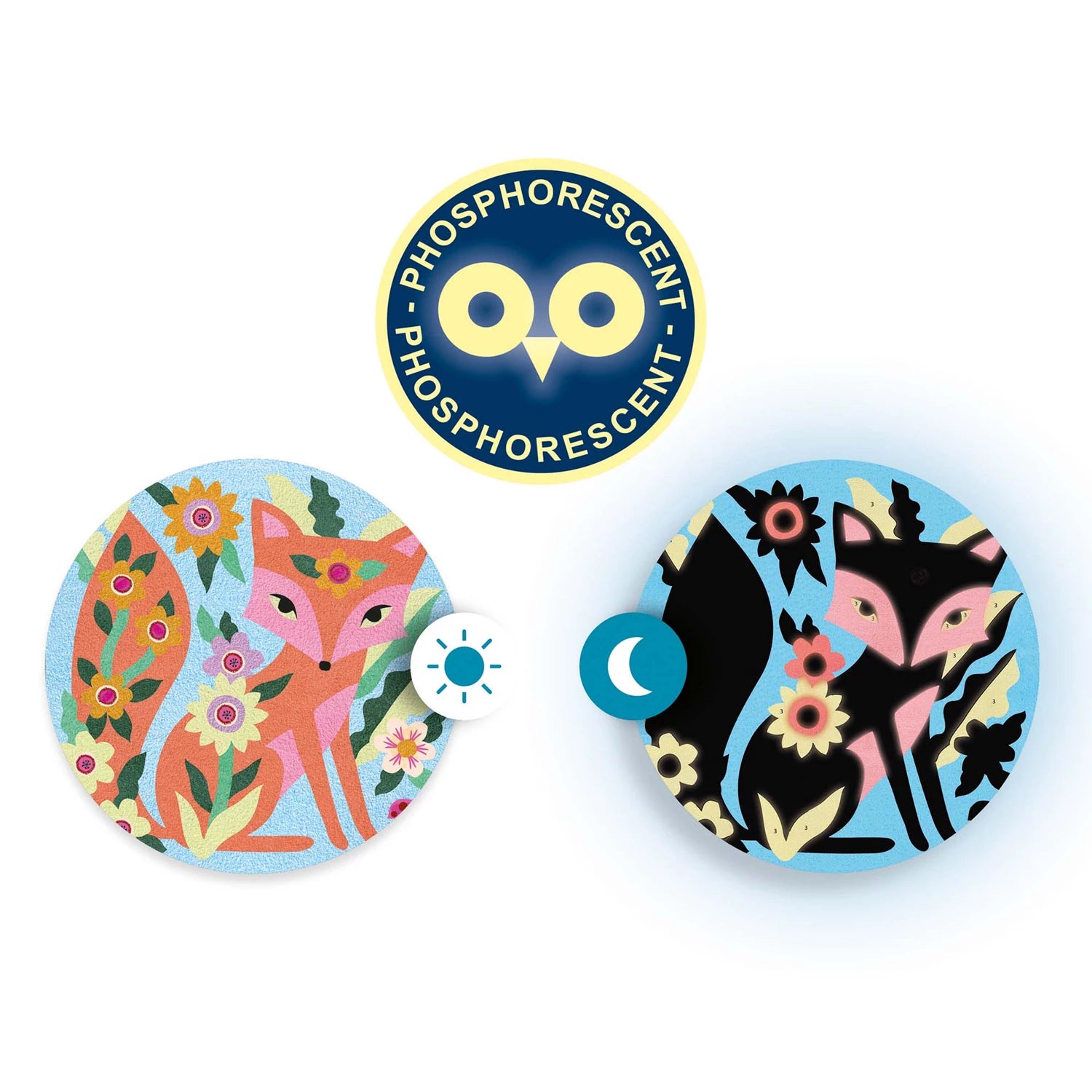4 immagini con animali notturni da colorare con sabbia colorata e fosforescente. Il bambino mette la sua immagine nella scatola, copre le aree pre-incollate con l'attrezzo fornito e poi le cosparge di sabbia secondo il codice colore dato nelle istruzioni. Quando le foto sono sistemate o appese, si ha una sorpresa quando cala il buio: le foto brillano al buio.