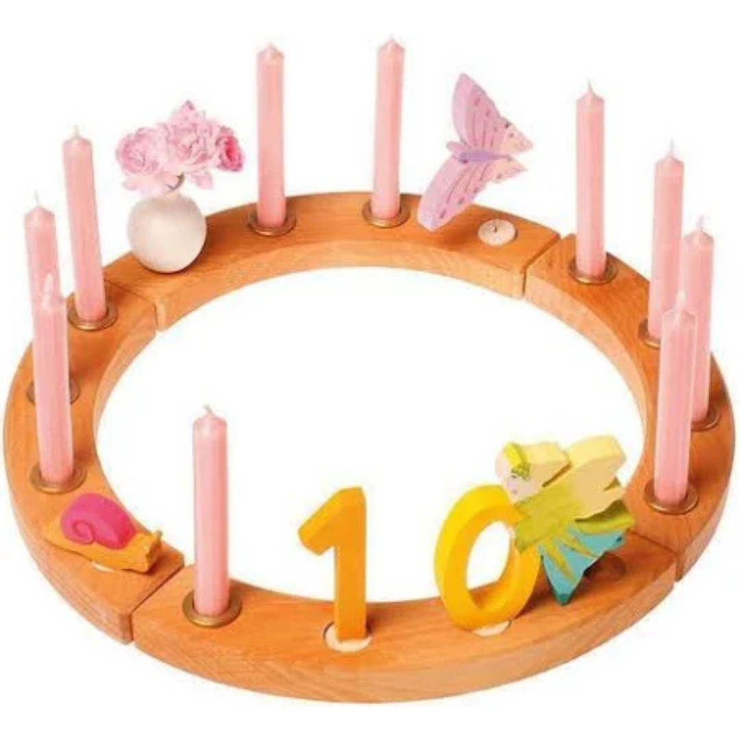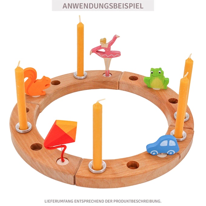 Per arricchire l’anello si possono aggiungere elementi stagionali come fiori, pigne, foglie, conchiglie ecc., le figure in legno Waldorf oppure si possono acquistare a parte le figure celebrative in legno con piolo Grimm’s, i porta candela e i porta biglietti.