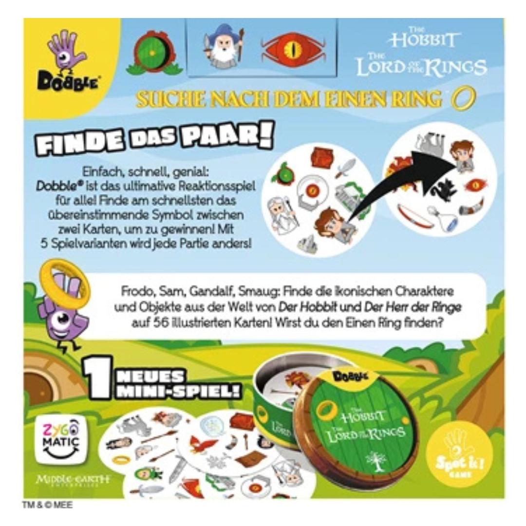 "Semplice, veloce, geniale: Dobble Il Signore degli Anelli è il gioco di reazione definitivo per tutti! Trova il simbolo corrispondente tra due carte il più velocemente possibile per vincere! Con 5 varianti di gioco, ogni partita sarà diversa! In Dobble Il Signore degli Anelli c'è una nuova variante di gioco: La Torre di Sauron. Frodo, Sam, Gandalf, Smaug: trova i personaggi e gli oggetti iconici del mondo de Lo Hobbit e Il Signore degli Anelli su 56 carte