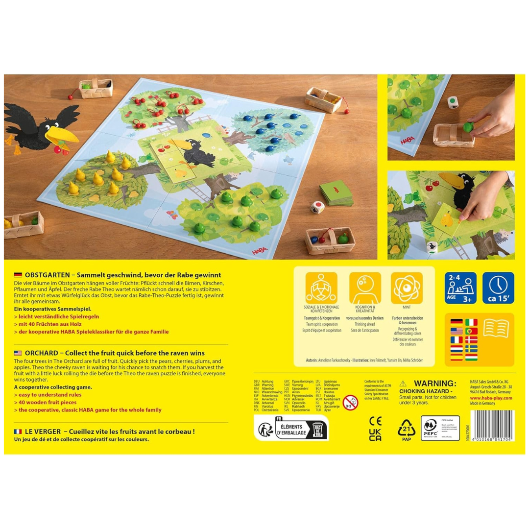 Il Frutteto è un gioco emozionante e divertente, adatto sia per giocatori singoli che per gruppi di fino a otto persone. I giocatori devono agire rapidamente per raccogliere i frutti maturi e succosi, prima che il furbo corvo colga l'occasione per rubarli. Con una durata di gioco di massimo 15 minuti, Il Frutteto offre un'esperienza dinamica e coinvolgente, che richiede sia pensiero strategico che azione veloce. Il gioco promuove la collaborazione e l'interazione, mentre i giocatori cercano di raccogliere i frutti e nel contempo ingannare il corvo. Il design accattivante e l'uso di materiali in cartone lo rendono una scelta ecologica per gli appassionati di giochi. Promuove il pensiero strategico e il lavoro di squadra.