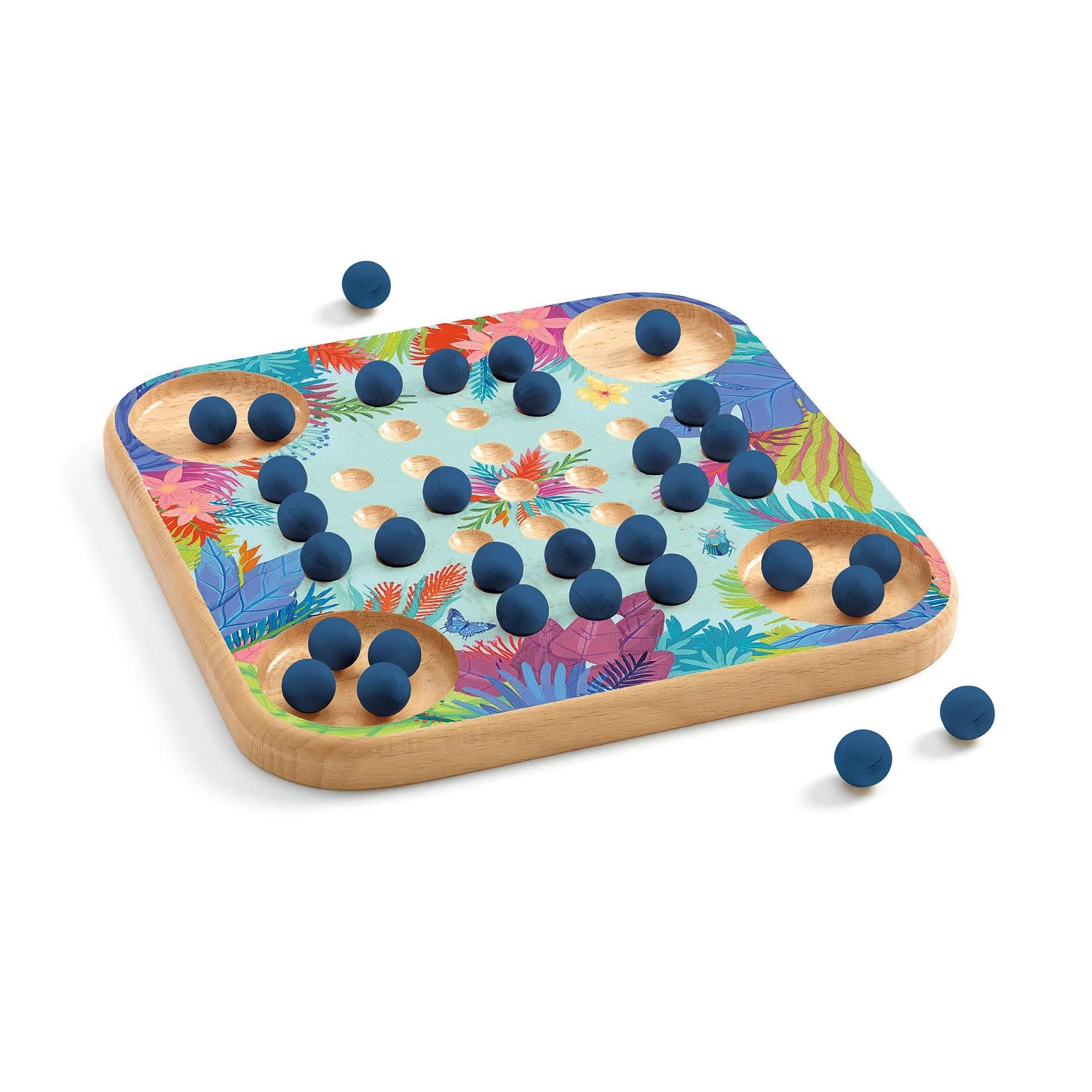 Contenuto: 1 tabellone di legno, 32 biglie di legno, 1 sacchetto in tessuto e 1 libretto con il regolamento del gioco in 10 lingue.