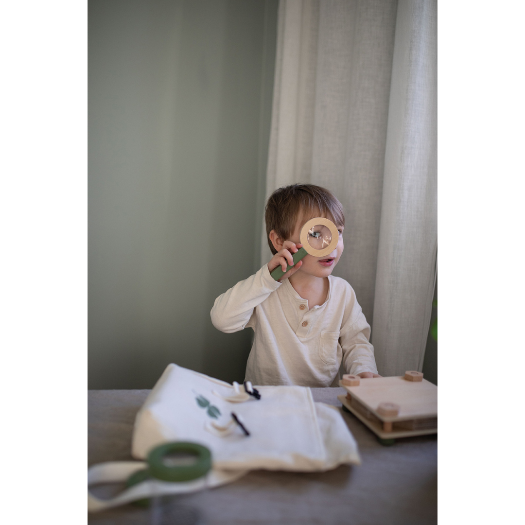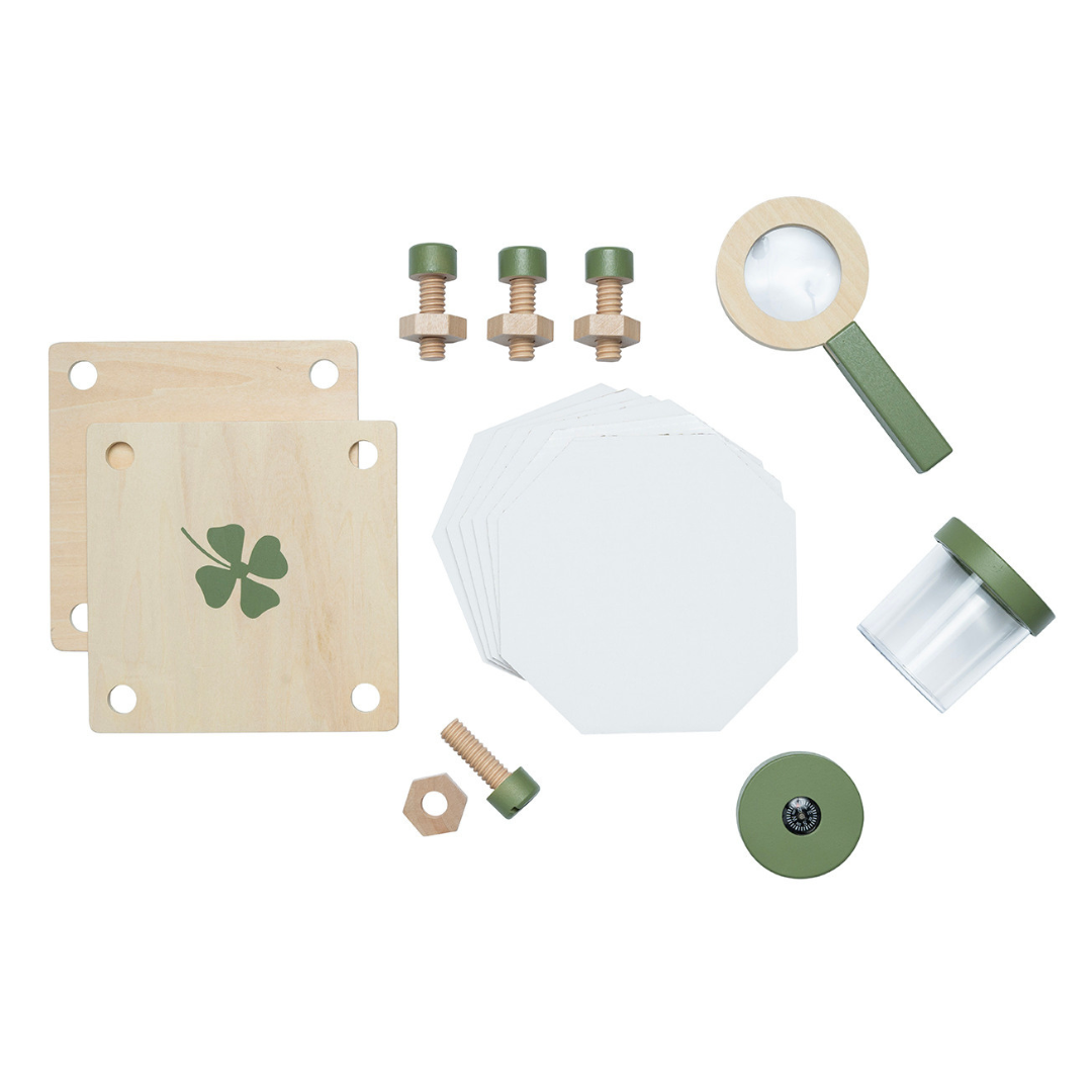 Scoprite i segreti della natura con questa borsa da esploratore! Dotata di strumenti come la lente d'ingrandimento, il vaso per gli insetti e la bussola, è perfetta per i giovani esploratori che si avventurano all'aria aperta.